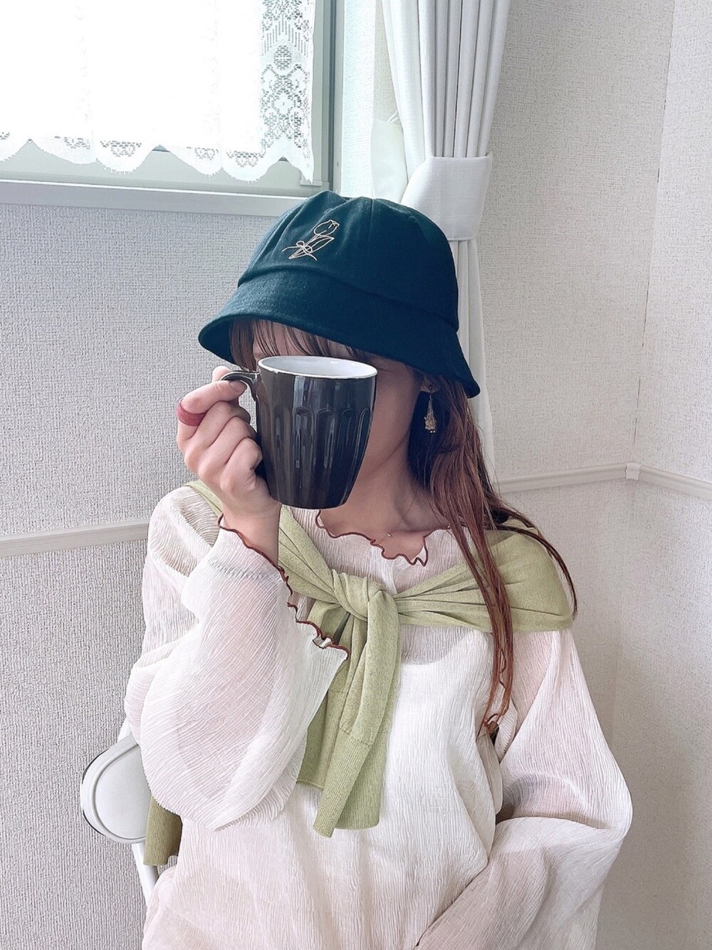 ぽーのハット「ワンポイント フロント花刺繍バケットハット【イラストレーターden×anown 限定コラボ】」を使ったコーディネート