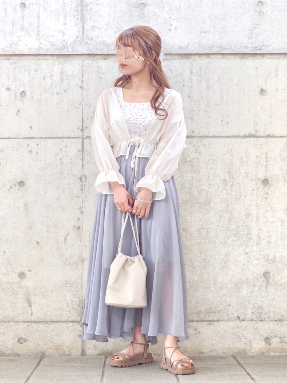 淡色女子コーデ𓂃◌𓈒𓐍 ふわっと広がるスカートがかわいい✿ 上下とも透け感あるアイテム合わせ 夏らしいし女の子らしいしオススメです♡ インナーの細かめ花柄がアクセント ❤︎︎ ˊ˗ Heather mini のお洋服ジャストサイズで 着やすくて本当にオススメ( ◜◡◝ )🍓 - - - - - - - - - - - - - - - - ▽肩幅をカバーする華奢見えコーデの提案 TikTok / Instagram ≫ pooo___24 ( アンダーバーは _ _ _ 3本です ) 低身長 / プチプラ / 淡色 / ゆるコーデ オススメコスメも不定期更新中✨ いいね、お気に入り、フォルダイン、 フォローもありがとうございます ◡̎✧