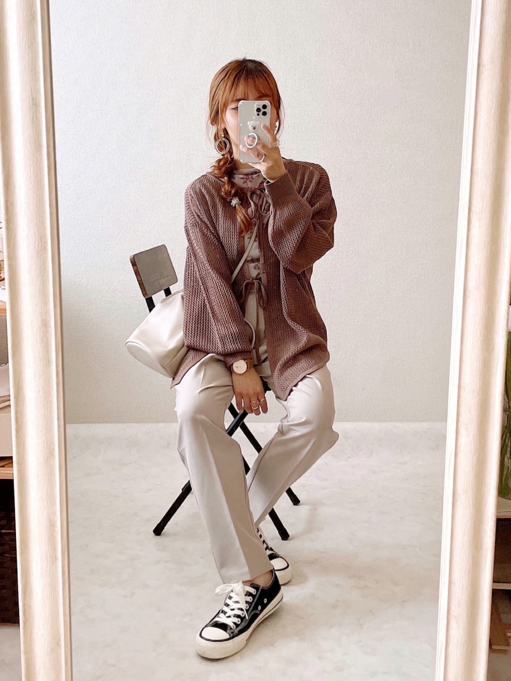 カフェオレコーデ༝ ༝ ༝☕️ 美脚見えなセンタープレスパンツ グレイッシュベージュなら いつもの淡色コーデによく似合う𓏸𓍯 GUのメッシュニット可愛すぎて2色お迎え🥰 首の詰まった感じのインナーを合わせると トレンド感と秋っぽさが出て良き🍁⸝⸝ - - - - - - - - - - - - - - - - ▽肩幅をカバーする華奢見えコーデの提案 TikTok / Instagram ≫ pooo___24 ( アンダーバーは _ _ _ 3本です ) 低身長 / プチプラ / 淡色 / ゆるコーデ オススメコスメも不定期更新中✨ いいね、お気に入り、フォルダイン、 フォローもありがとうございます ◡̎✧