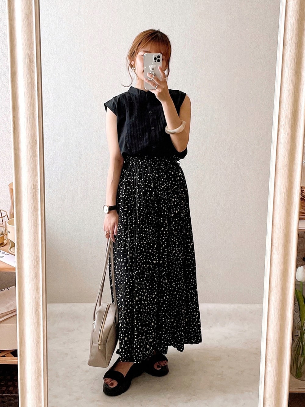 ブラックコーデ ❤︎︎ ˊ˗ ボストンバッグを合わせるだけで 秋らしさが増してく ( ◜◡◝ )🧺⸝⸝ 【 フレンチスリーブ + ロングプリーツスカート 】 同系色でまとめたらめちゃスタイルよく 見えるしお洒落でオススメ𓏸𓍯 - - - - - - - - - - - - - - - - ▽肩幅をカバーする華奢見えコーデの提案 TikTok / Instagram ≫ pooo___24 ( アンダーバーは _ _ _ 3本です ) 低身長 / プチプラ / 淡色 / ゆるコーデ オススメコスメも不定期更新中✨ いいね、お気に入り、フォルダイン、 フォローもありがとうございます ◡̎✧