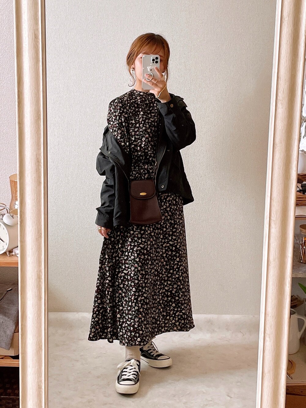 ぽーのワンピース「【PURIL】花柄ウェストギャザーフレアワンピース」を使ったコーディネート