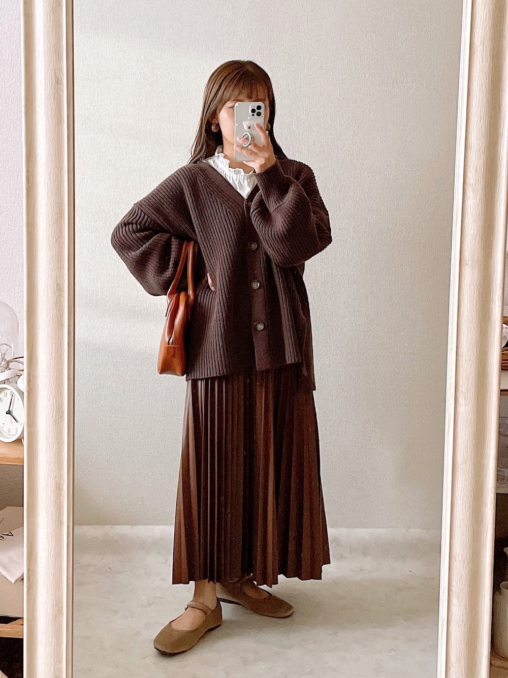 ぽーのカーディガン/ボレロ「片畦ボリュームニットカーディガン」を使ったコーディネート