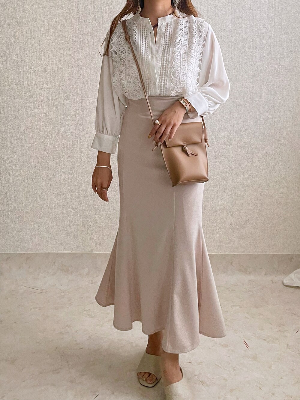 オフィスコーデ( ᴗ ̫ ᴗ )🪞꙳⋆ ✳︎. マーメイドに白ブラウスって 可愛いし仕事できそうに見えない?🤥 たっぷりレースちょうかわいいい🤍