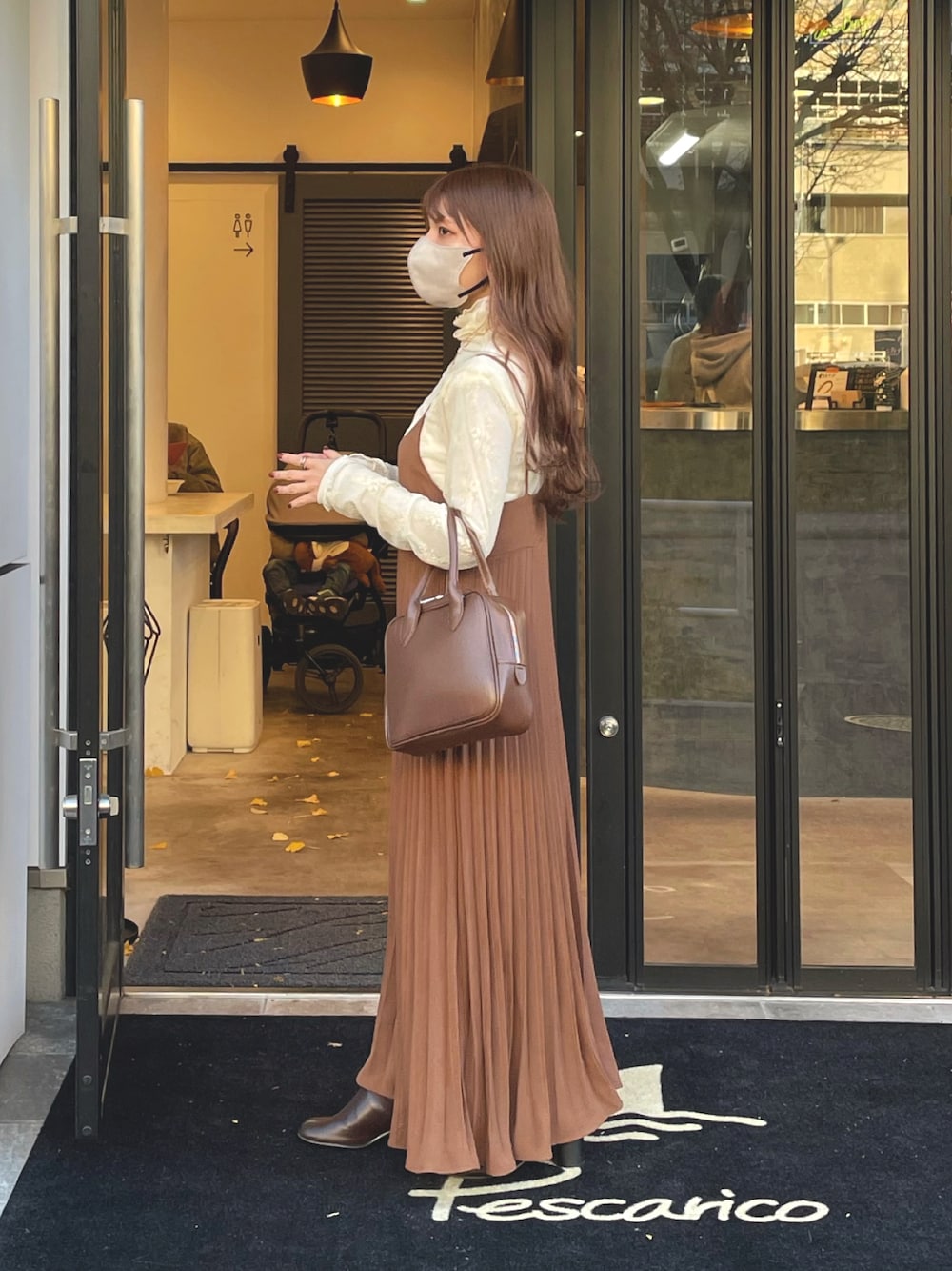 今日販売の新作ワンピース♡ チョコみたいな可愛い色味と ふわっとプリーツがお気に入り🍫