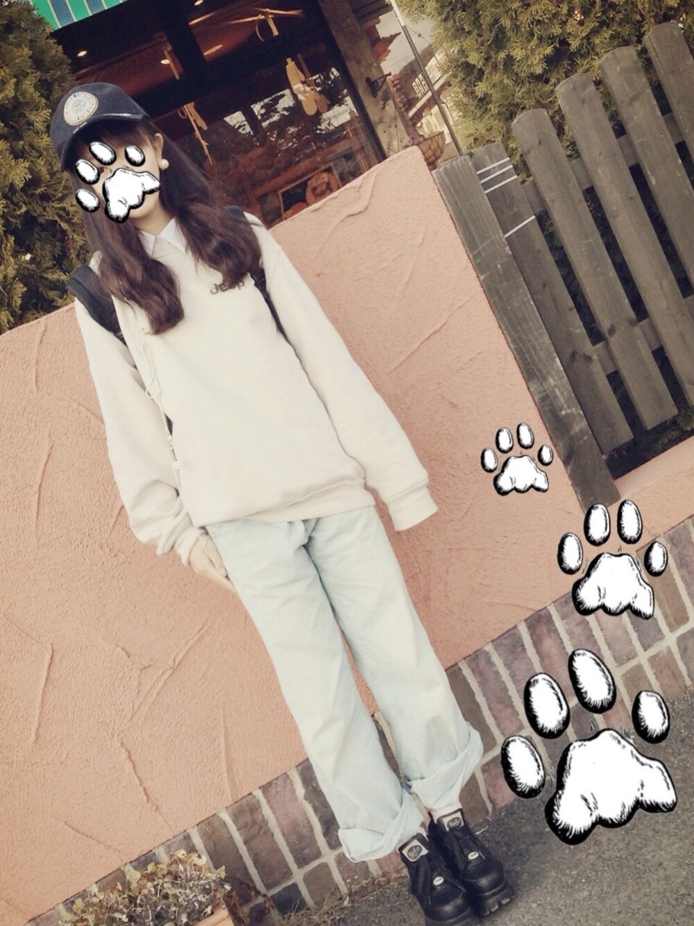 ベージュ系のスウェット、その他のデニムパンツを着用したメンズの冬コーディネートの1枚目の写真