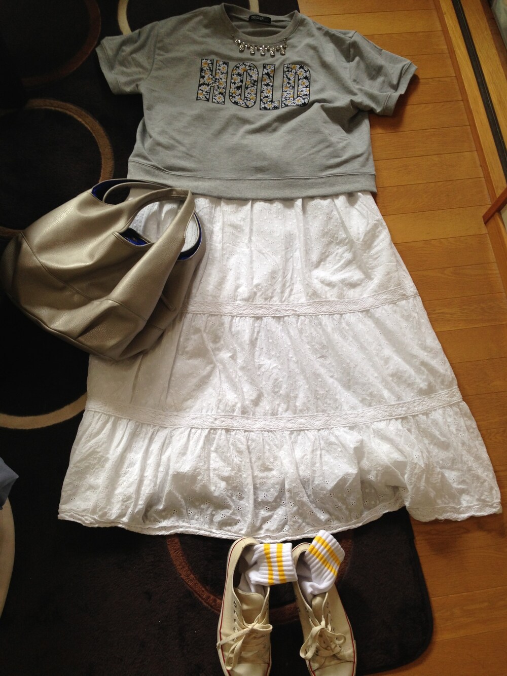 休日コーディネート(≧∇≦) 暑くてワンピースを着てみました!足元はスニーカーでカジュアルに仕上げました! 靴下はおNEW\(//∇//)\トップスの花柄の文字の所が黄色を使われてるんで黄色のライン靴下をチョイス(≧∇≦) スニーカー、洗えば良かったな(>人<;)