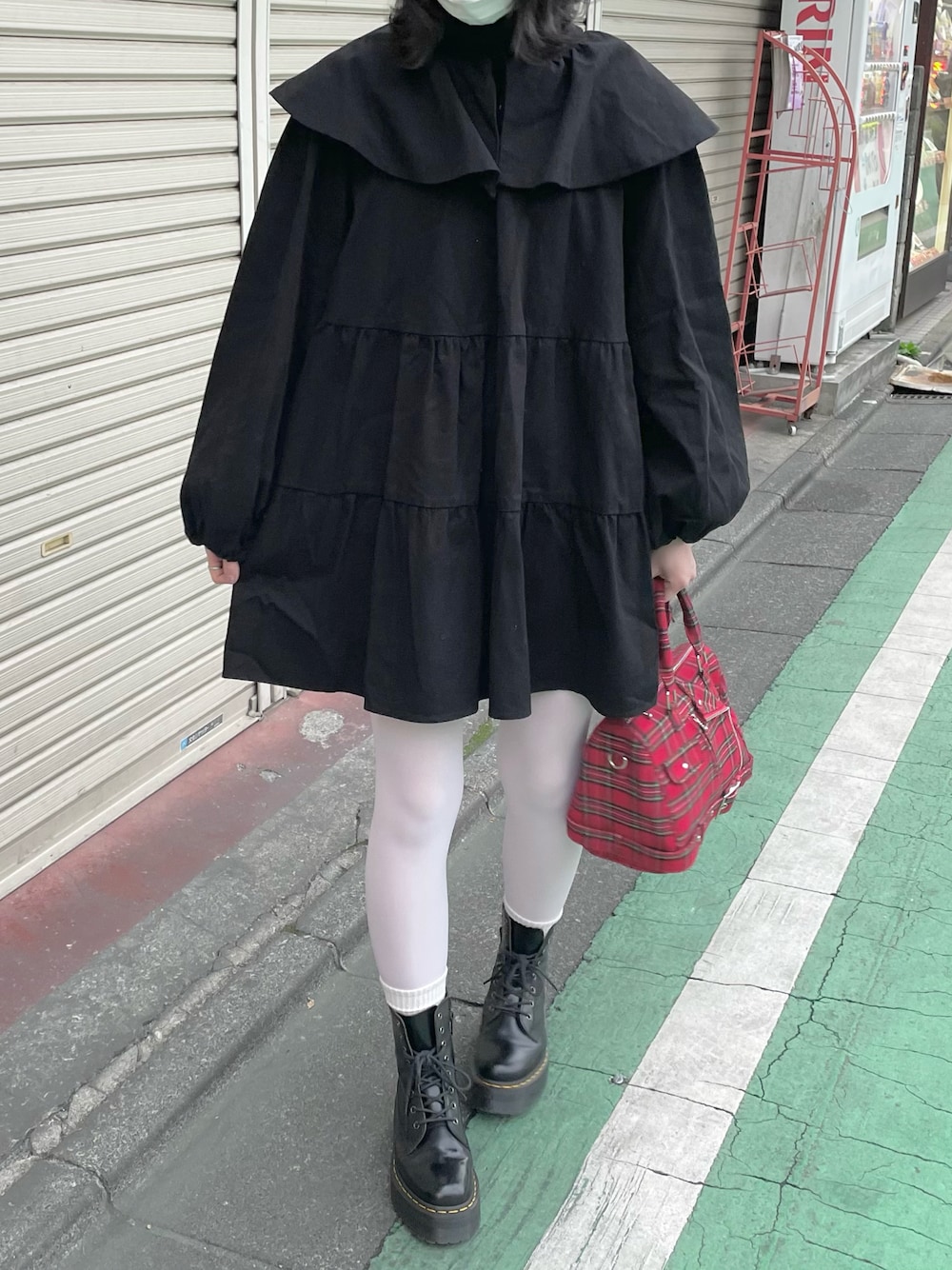 白タイツ久々に履いた🌛🖤 H&Mのワンピは襟もシルエットも全部お気に入り〜フリル最高🫶