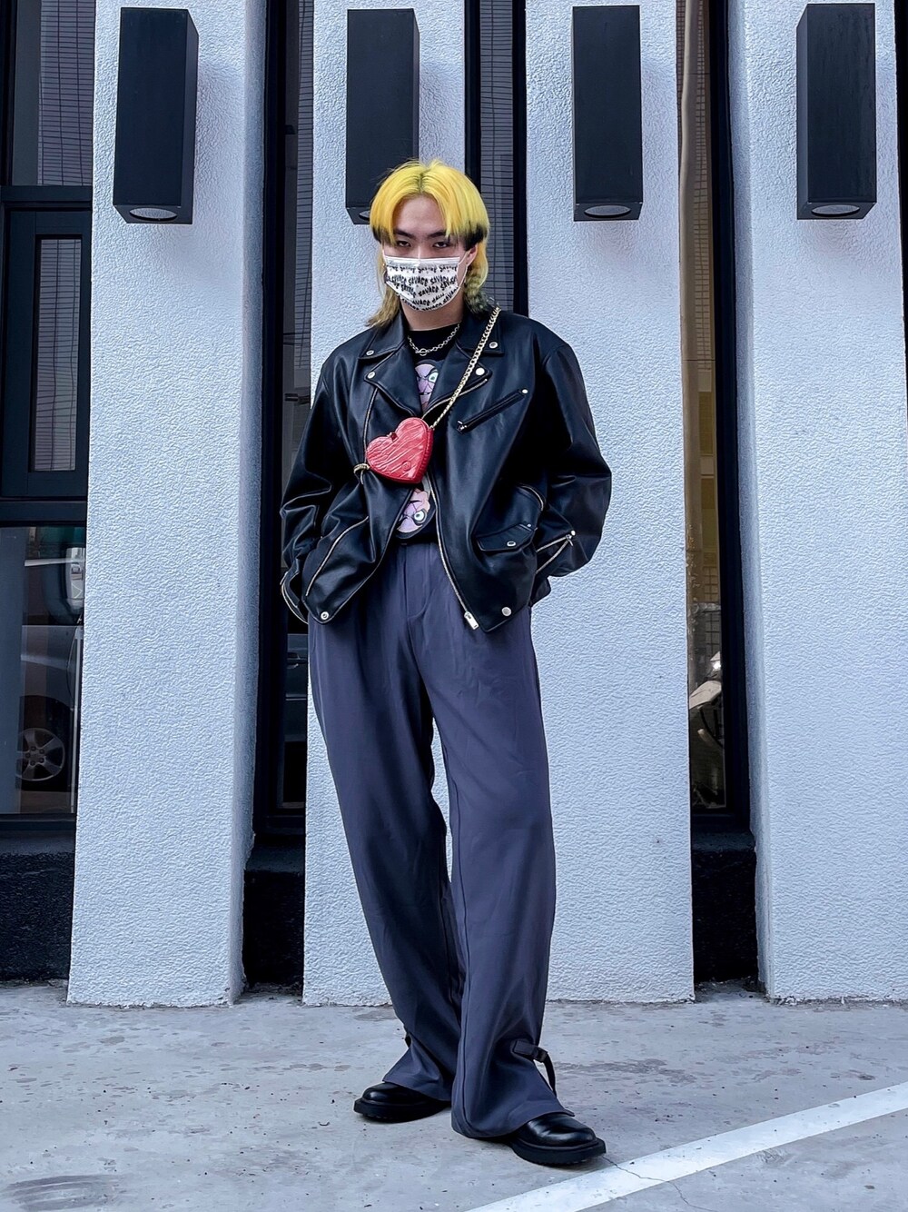 レッド系のショルダーバッグ、ブラック系のライダースジャケットを着用したメンズの春コーディネートの1枚目の写真