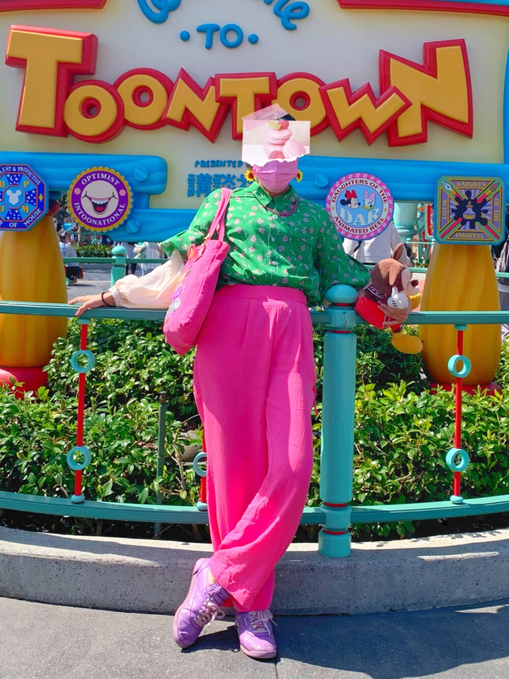 ピンクとグリーンってやっぱ可愛い💗💚 ディズニー春コーデです🤛 GUのアンダーカバーコラボブラウスを着てます💚 袖のフレアに硬い生地が入っていて形が可愛いのでお気に入り🥰