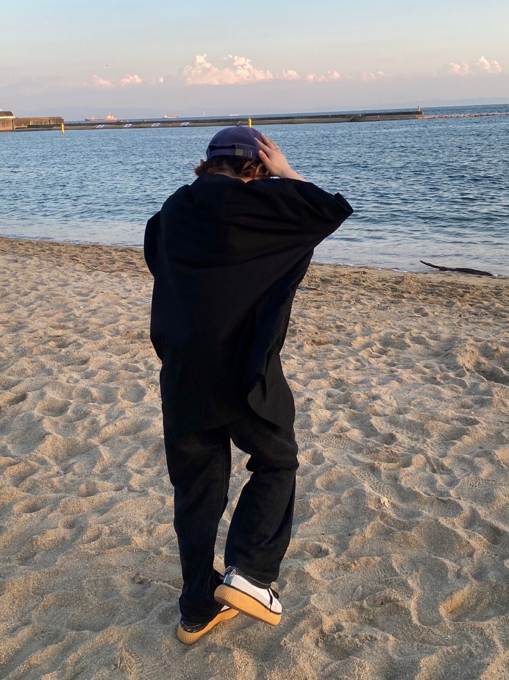 今日はオールブラックで青いキャップ引き立てコーデ🏁🧢 夕方の海が心地良すぎて無限におれた🫠