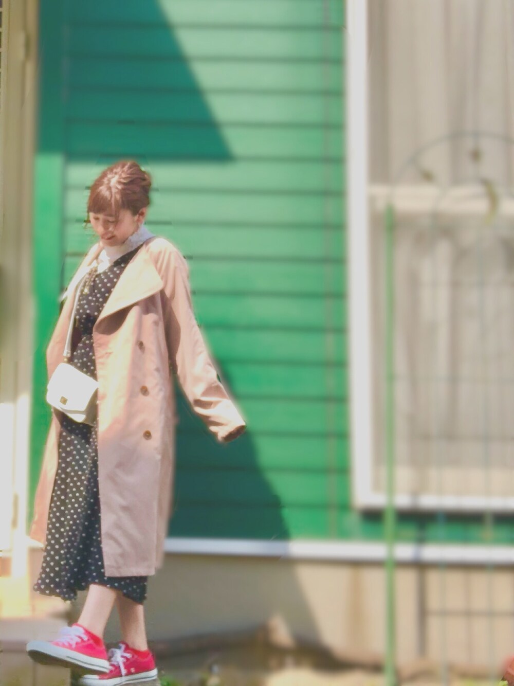 GUのワンピースとトレンチコートでプチプラコーデ💗 今日もポカポカ春日和ですね〜🐝🌷🐝🌷🐝 このワンピース持ってる人多いよね!デニムジャケットに合わせるのも可愛いけど、トレンチコートも可愛いよ!💗