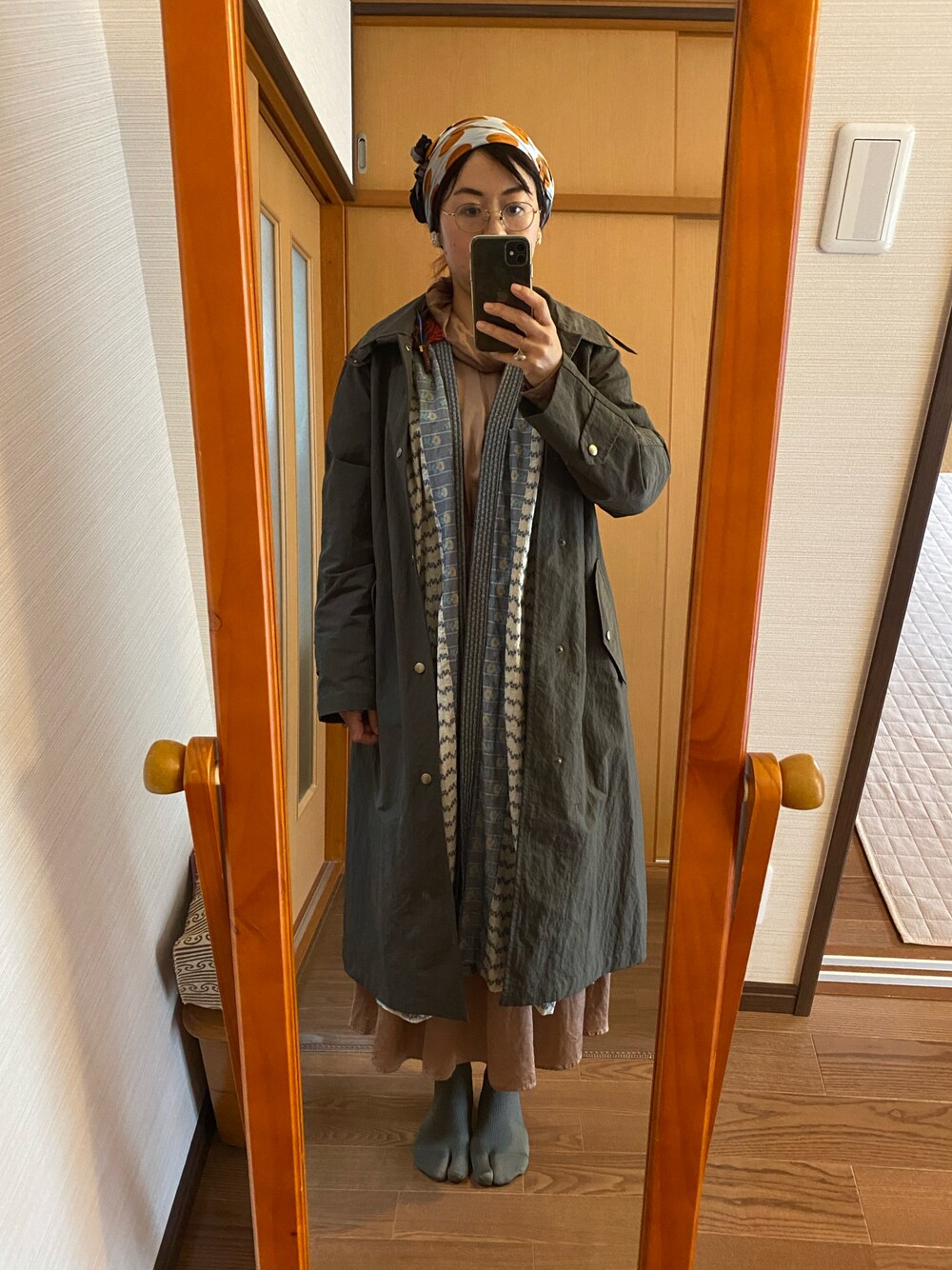 雨の日☁️☔コーデ こんにちは いつもご覧くださる皆様ありがとうございます○🙇♂️ 今日はレインコートが主役のコーデ🌧 GASA* 草原の道 羽織りは今日は殆ど隠れています 寒いので色々着込んでしまいました😖🍃 ではまた post📮する かもしれません