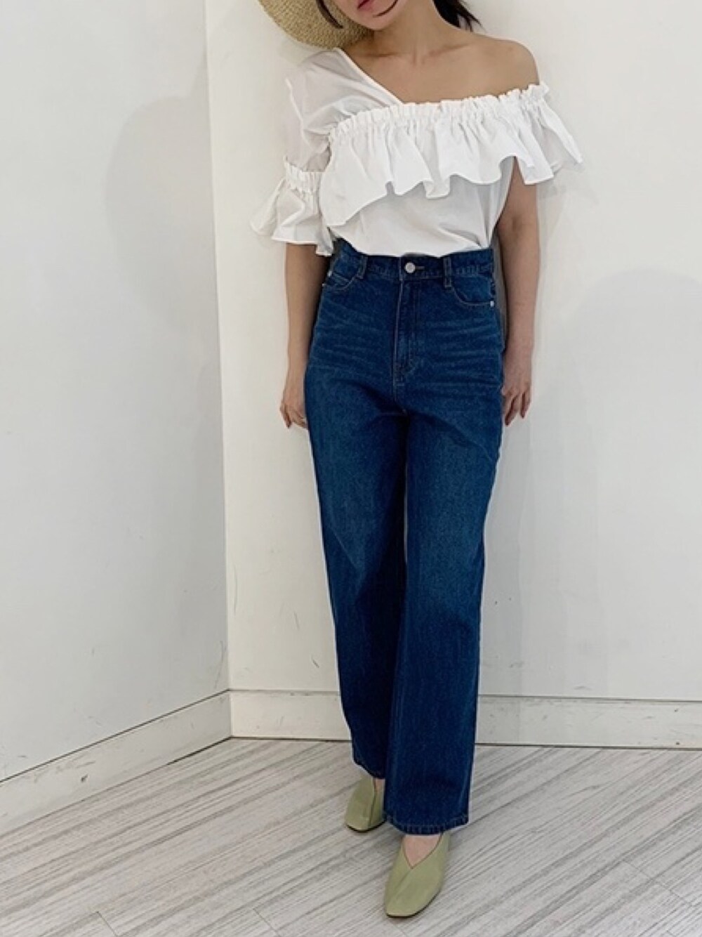 👚ワンショルダー ボリュームフリルブラウス 👖ハイウエストストレートデニムパンツ 👠Vカット フラットシューズ