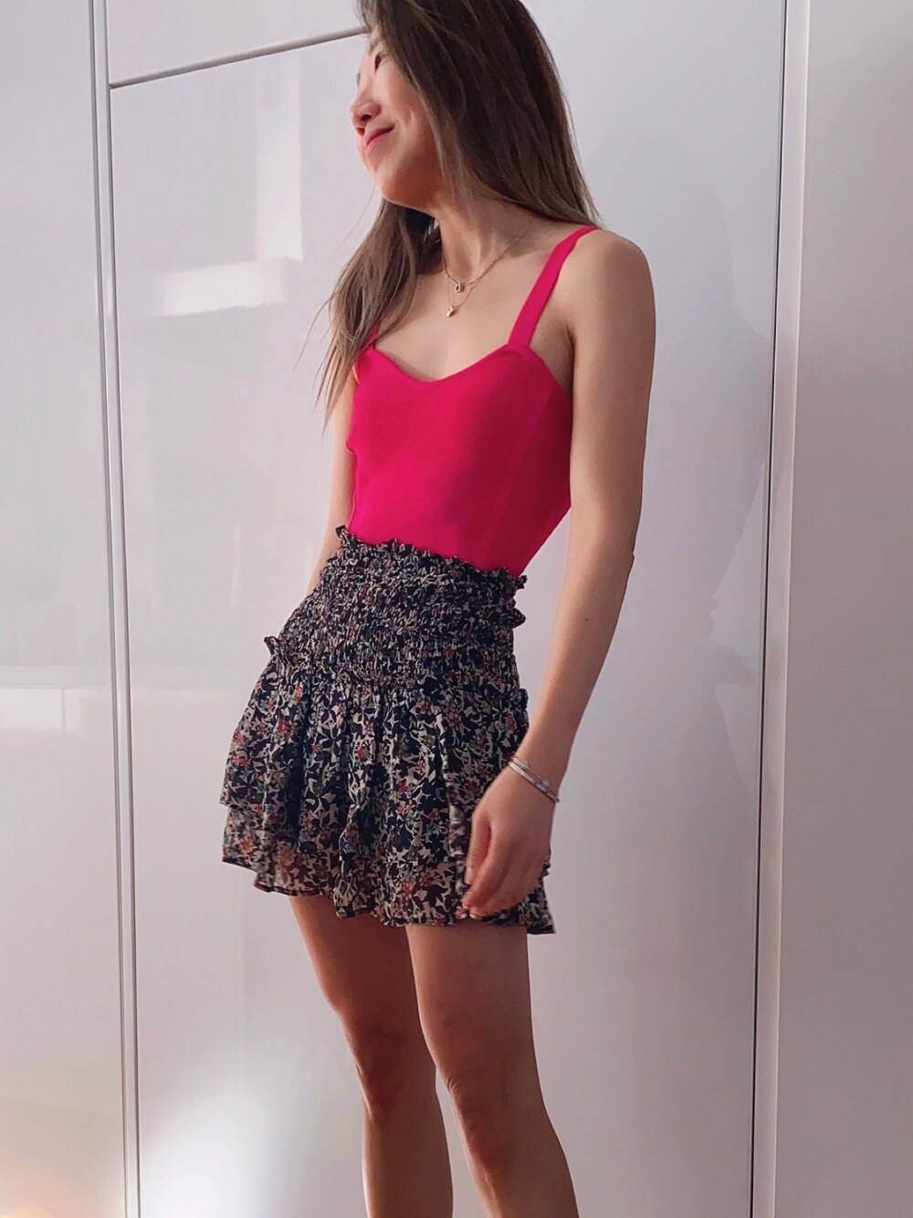 Bright colored tank and floral mini skirt for summer IG: @bySheree