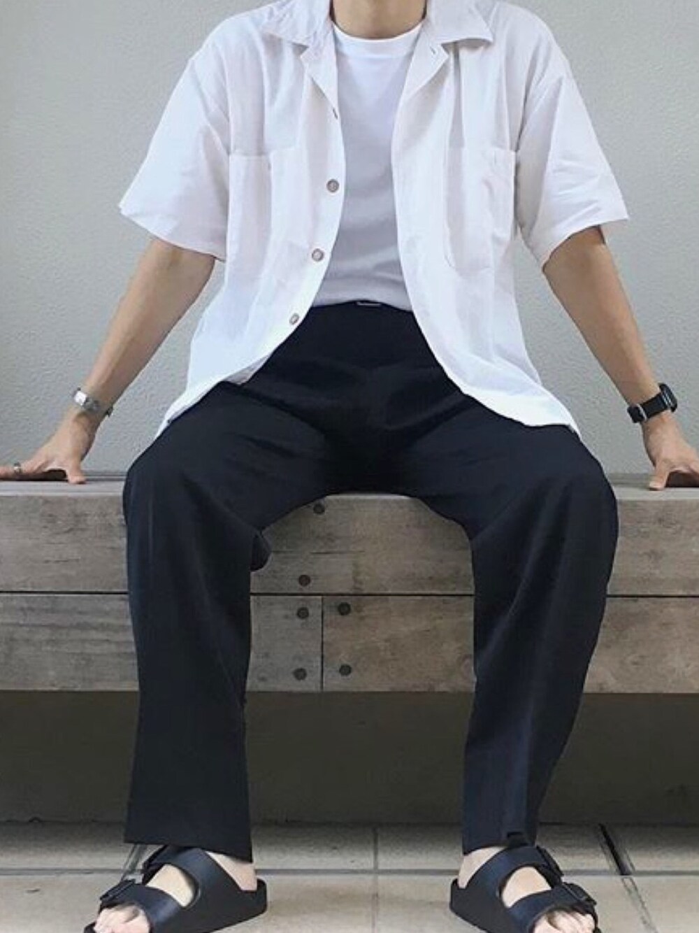 ホワイト系のトップスを着用したメンズの夏コーディネートの1枚目の写真