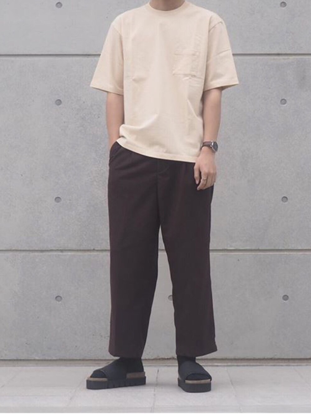 ブラウン系のスラックスを着用したメンズの夏コーディネートの1枚目の写真