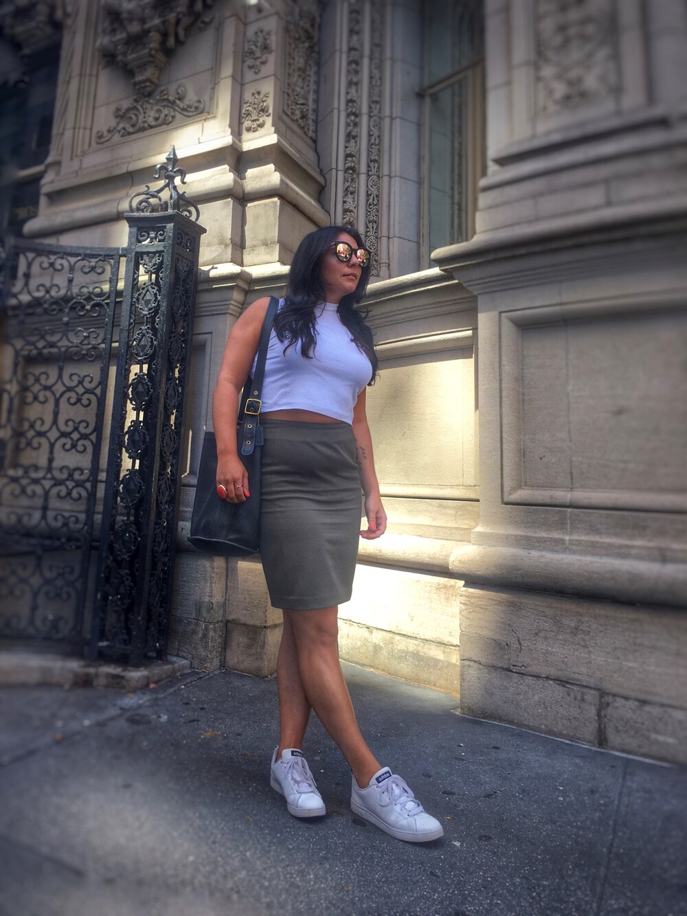 Styled down the harsh lines of a pencil skirt with a casual crop top and white sneakers.