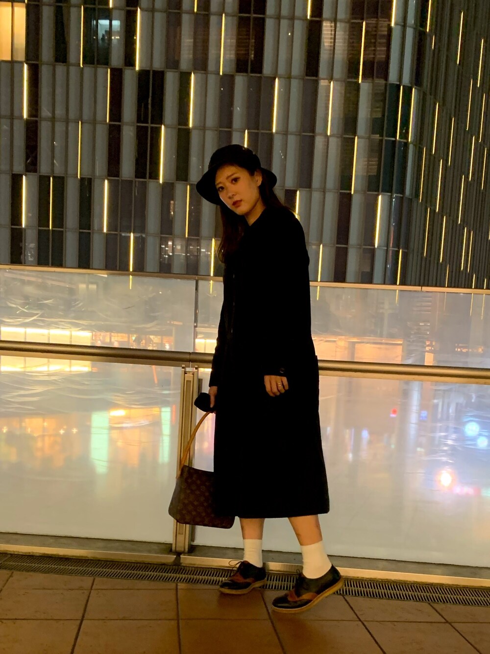 ブラック系のワンピース、ブラウン系のローファー、ブラック系のハットを着用したレディースの秋コーディネートの1枚目の写真