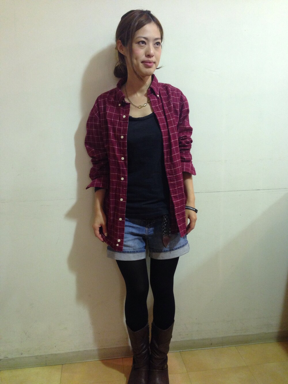 カジュアルシャツコーデ ボルドーにデニムでカジュアルさを。