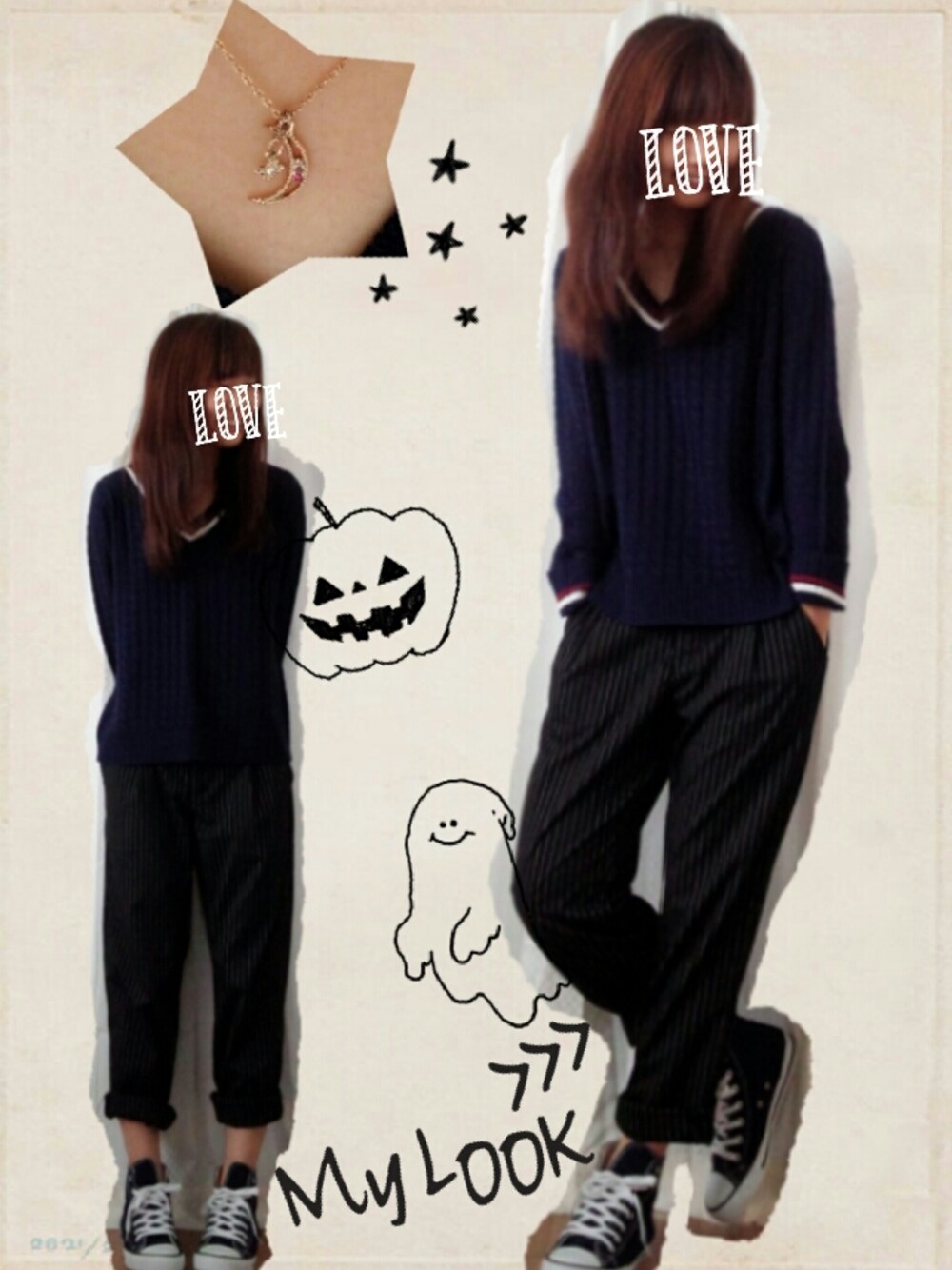 今日のおでかけコーデ。 なーんも考えてない、 シンプルすぎ、ゆるすぎ(笑) だからハロウィン風にコラージュして ちょっとだけ盛りましたすみません(x_x) ネックレスはお月さま、可愛い。