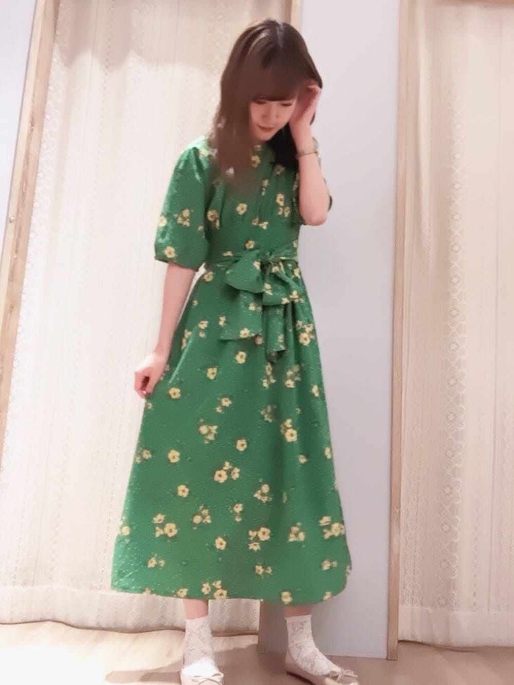 ドットも花柄も兼ね備えている最強に可愛いワンピースです🥐ウエスト部分のリボンも可愛いうえにスタイルアップできるのでかなり優れものです🍞緑が鮮やかで目を引きますね〜🥖