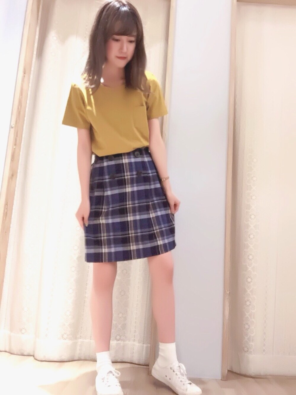 Tシャツとチェックスカートとスニーカーでカジュアルに着こなしてみました🐯スカートは今年流行の前釦型になってます🦁