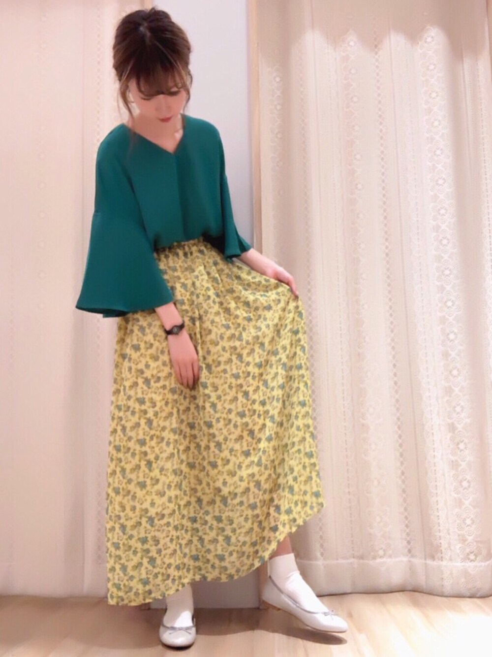 花柄スカートも合わせるアイテムによって甘くなりすぎずに着れます🧙🏻♀️とろみ素材の緑のブラウスと合わせて大人っぽく🧙🏻♂️