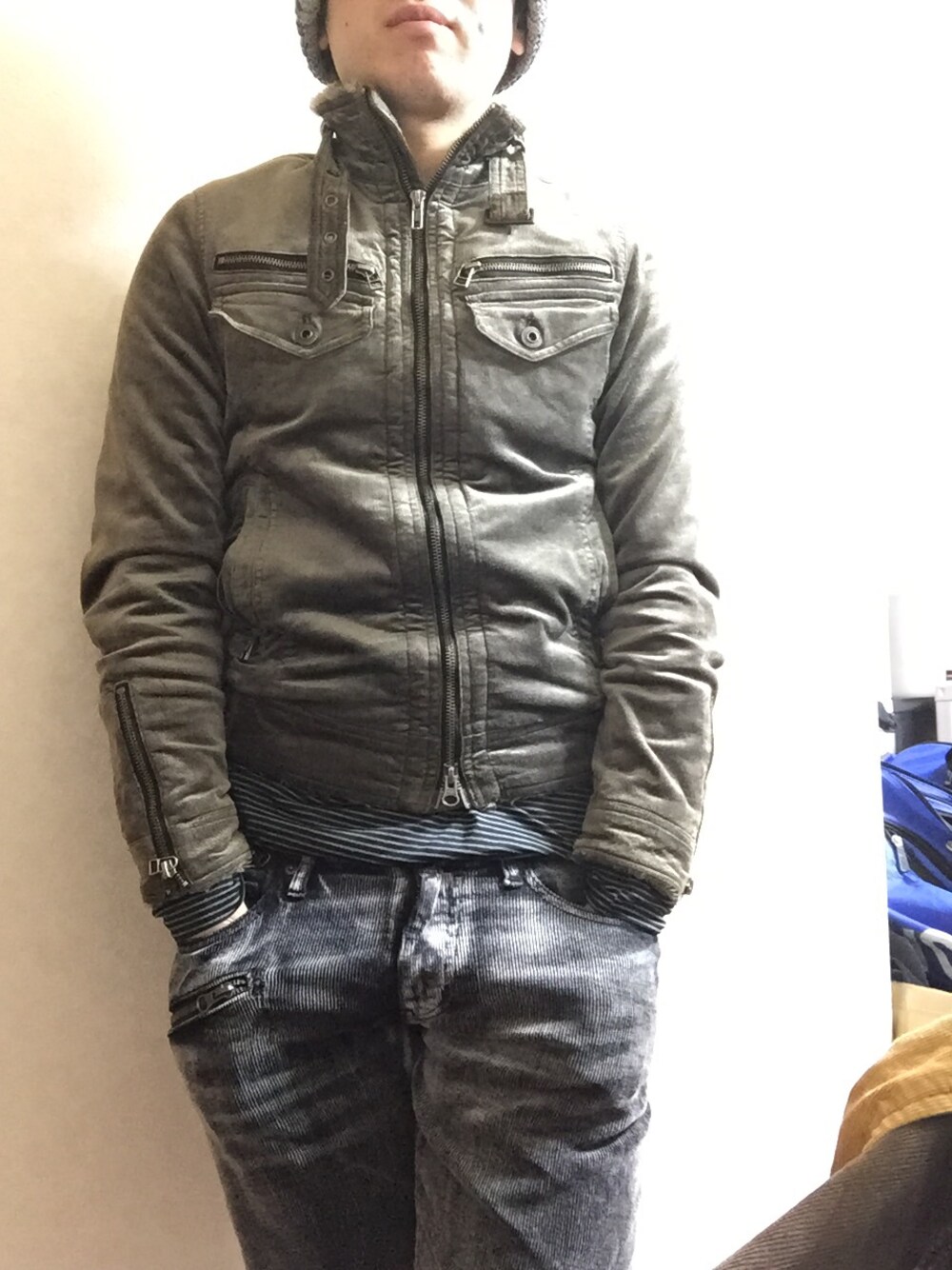 アウター&ジーンズはコーデュロイで合わせて、インナーはUNIQLOのボーダー柄ヒートテックでコーディネート!
