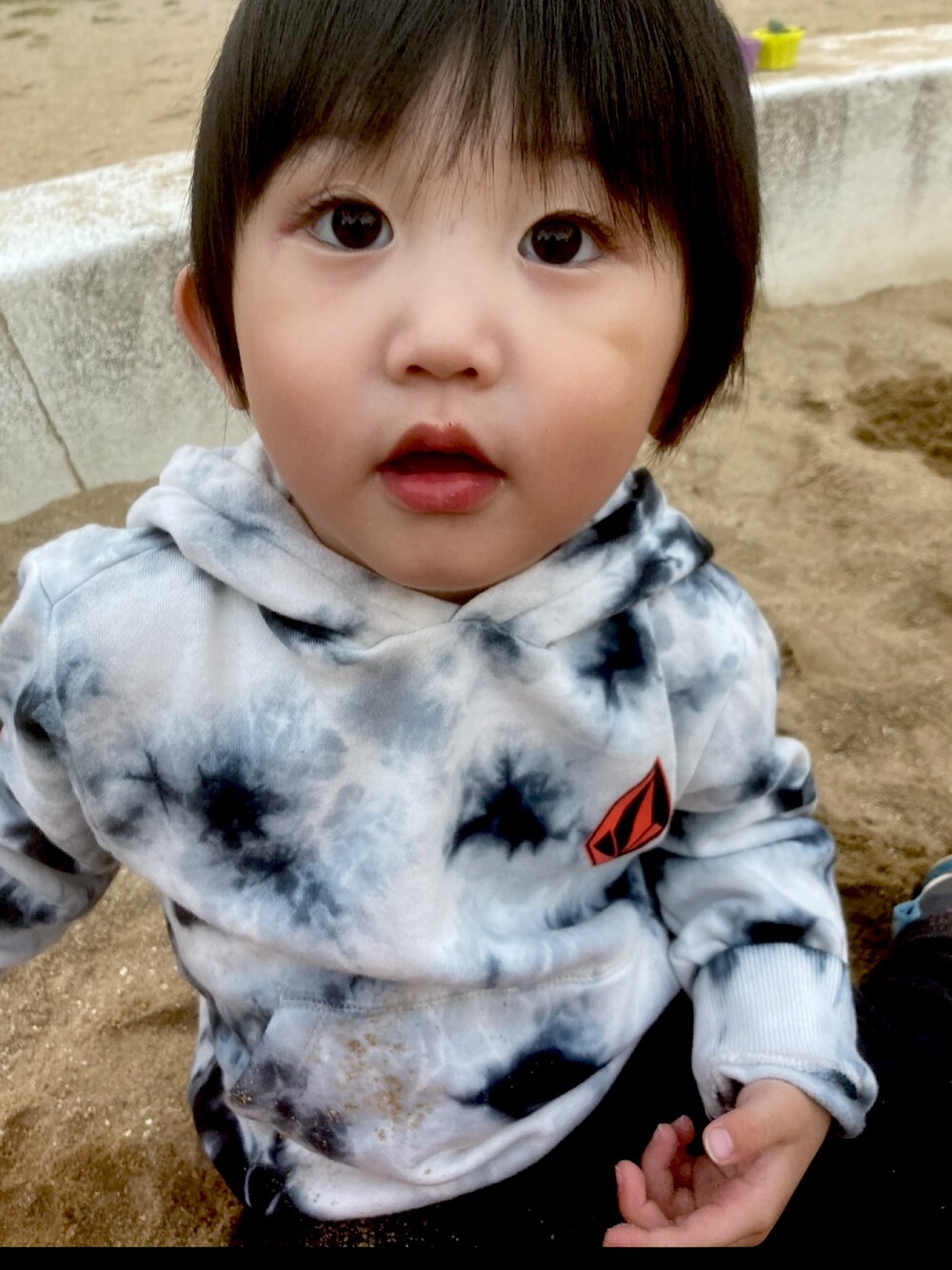 グレー系のパーカーを着用したキッズの冬コーディネートの1枚目の写真