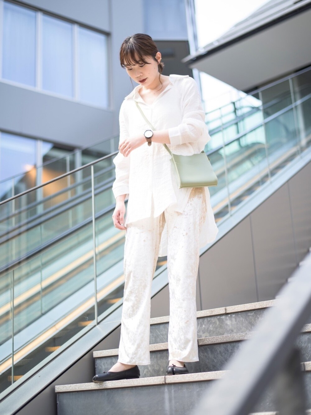 オールホワイトで爽やかに◎ 差し色にパステルカラーのミニバッグを合わせることで春っぽさアップ!