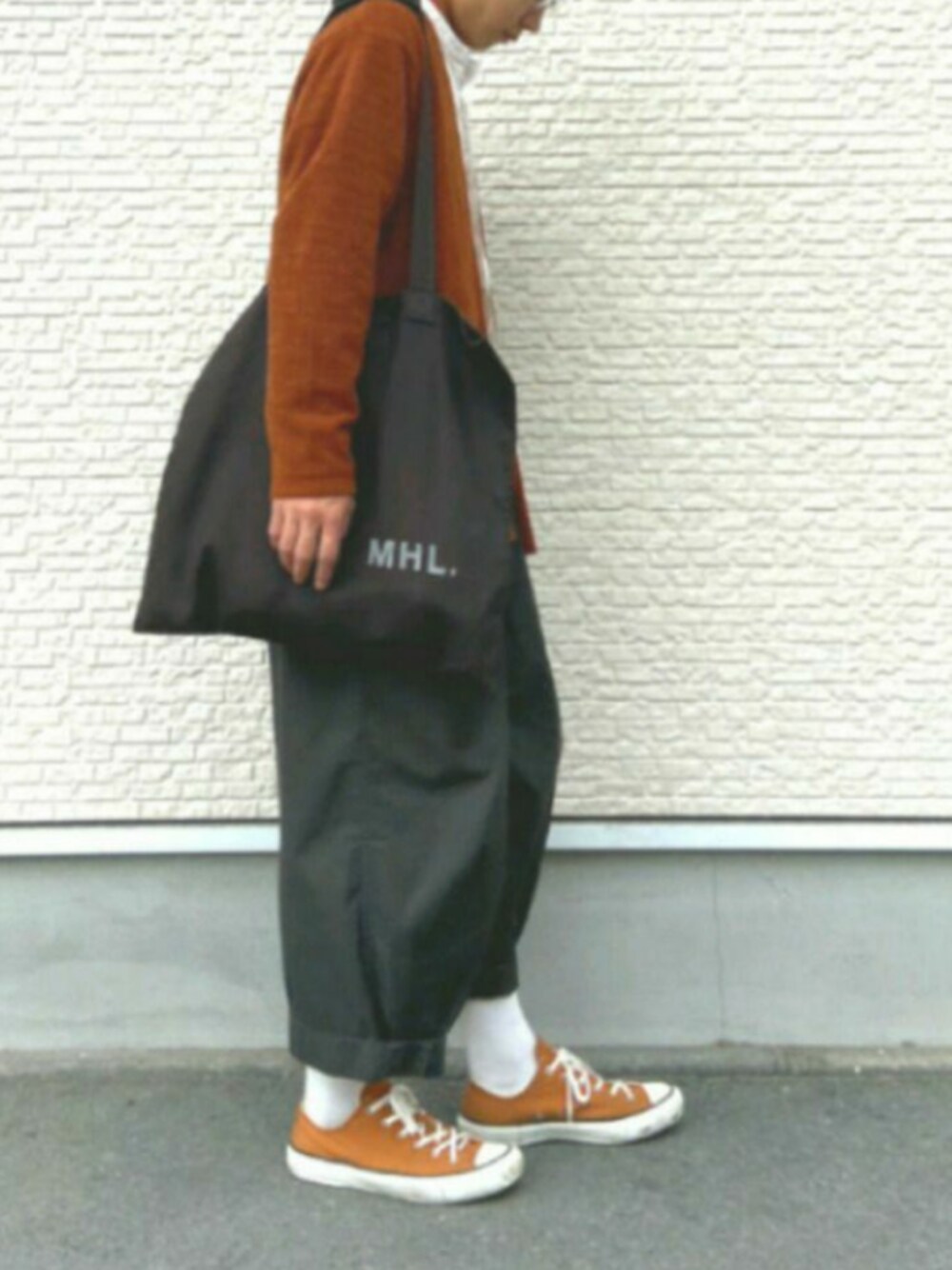 オレンジ×ホワイト×ブラック オレンジのカーディガン、スカーフ、スニーカー、ベルト(見えてない…)と、ホワイトのシャツ、ブラックのワイドパンツ、トートバッグを合わせたコーデ。 オレンジの面積多めなので、他はモノトーンにしてコーデ全体を引き締めました。 最近涼しくなってきて秋コーデできるから嬉しい◎