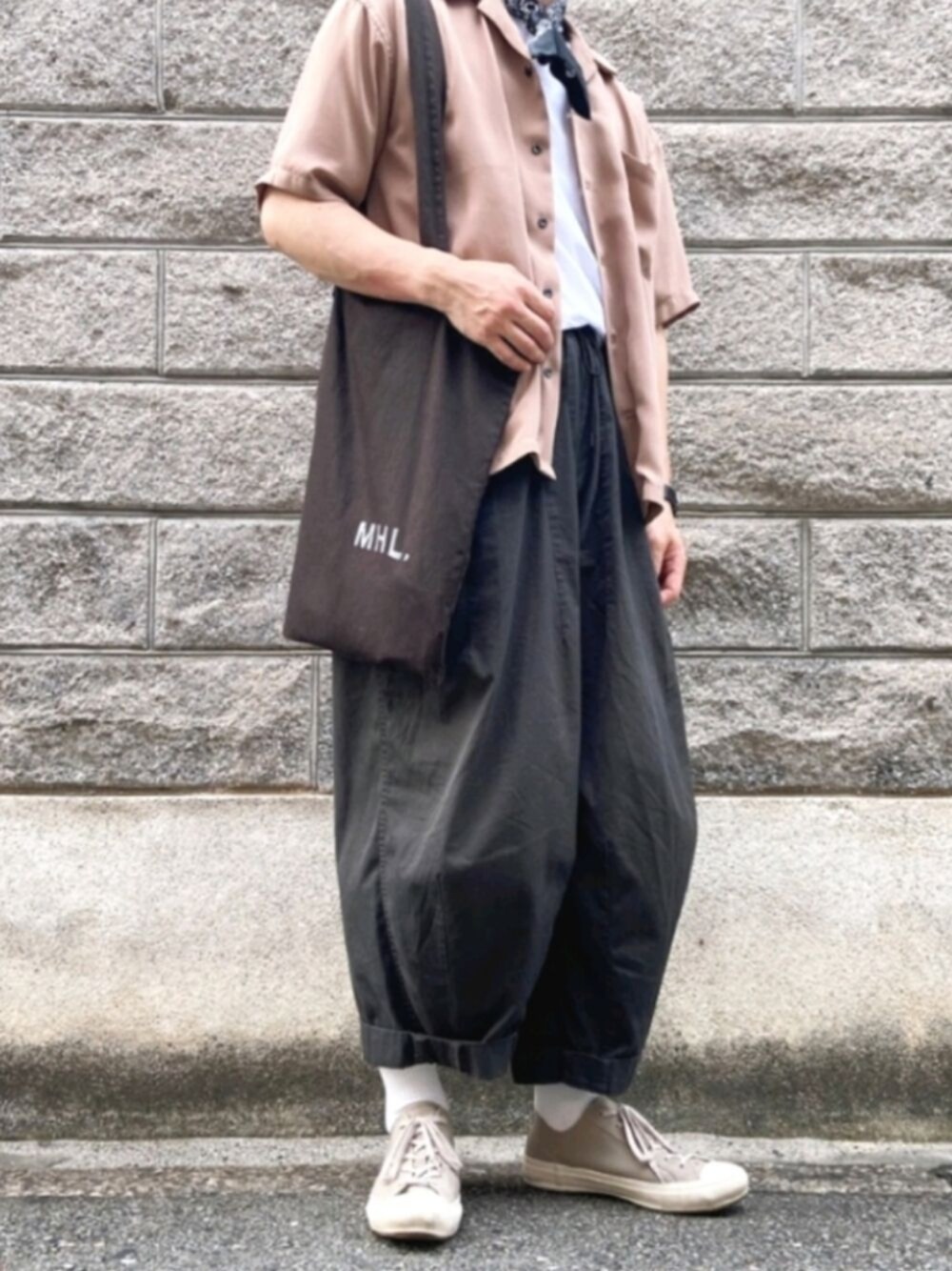 ベージュ×ホワイト×ブラック ホワイトのTシャツをブラックのワイドパンツにタックインしたモノトーンコーデに、ベージュのオープンカラーシャツを羽織ってベージュのスニーカーを合わせて統一感を、そこにスカーフを合わせて爽やかな印象のコーデにしました。 愛用しまくりのブラックのワイドパンツ、簡単にきれいなAラインコーデにできるのでよきです◎