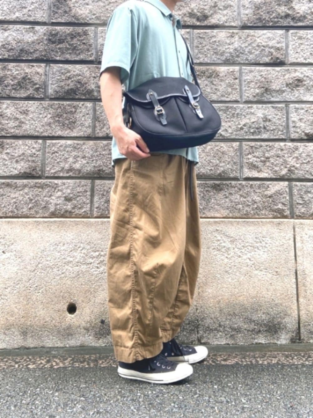 ミント×ベージュ×ブラック ミント色のシャツとベージュのワイドパンツを合わせて、ブラックの小物でコーデを引き締めました。 このサイズのブレディバッグはコーデを引き締める時いい仕事してくれる◎