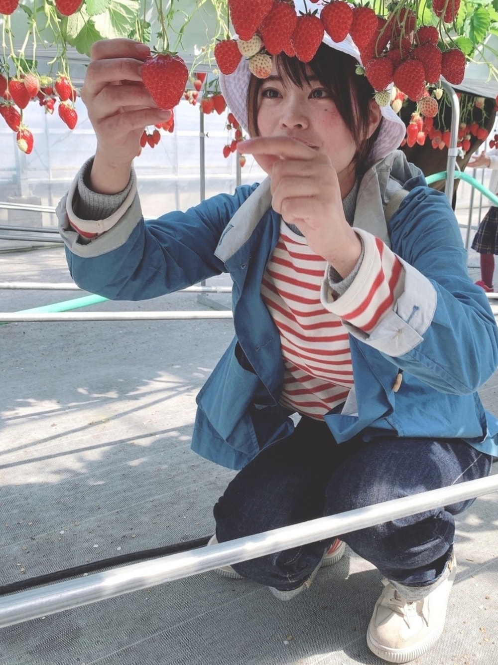 顔が見えてて申し訳ない🙇♀️ 普段ボーダーとかきいひんけど、 いちご狩りコーデに取り入れてみた! 夢中でいちご貪る人の図🍓🍓