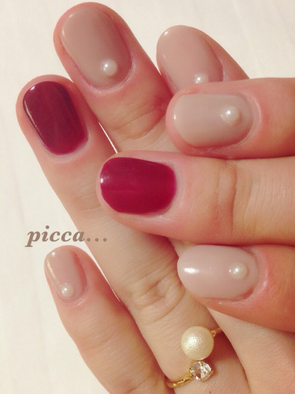 バイト休みなので久々のネイル( ´ ▽ ` ) 秋なのでボルドーとアッシュベージュで、パールで甘めに仕上げました(*^_^*)