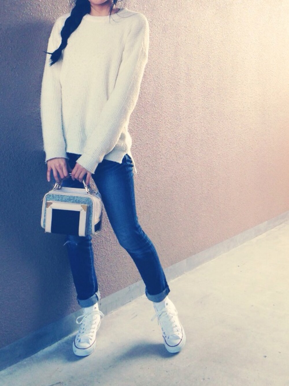 ラフな感じで。 右足の膝に空いてるデニムの穴は 母がはいたときに転けて破ったもの。笑 SHIPSで買ったポシェットはお気に入り!