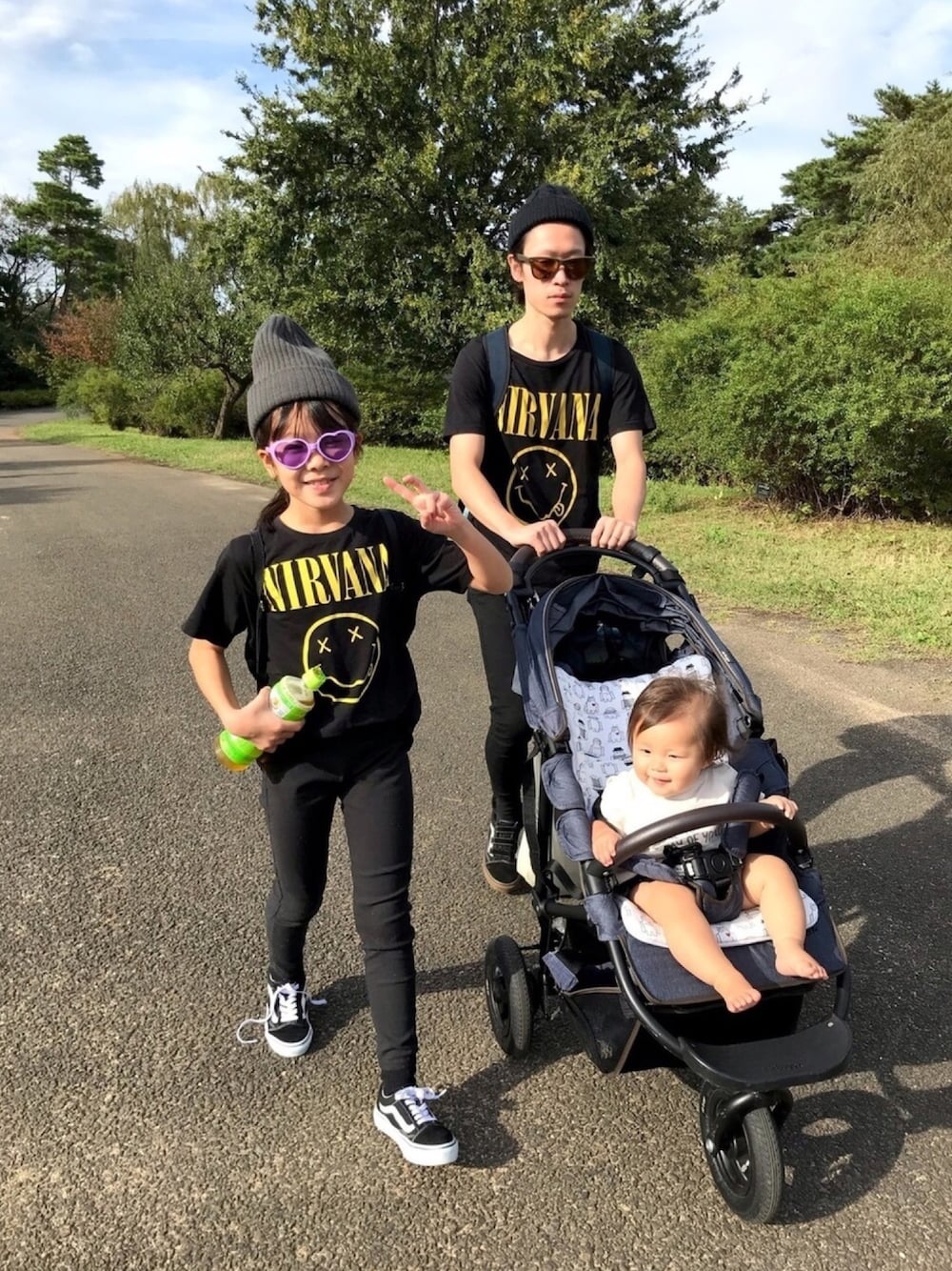 家族で公園久しぶり 朝から2人でゴソゴソやってると思ったら 娘がコーデ考えてましたw 普段おそらく着ないシャツを着た夫に少しにやけました パリピメガネと解けた靴紐の娘と👻 無表情の夫と😶 裸足の乳児😋