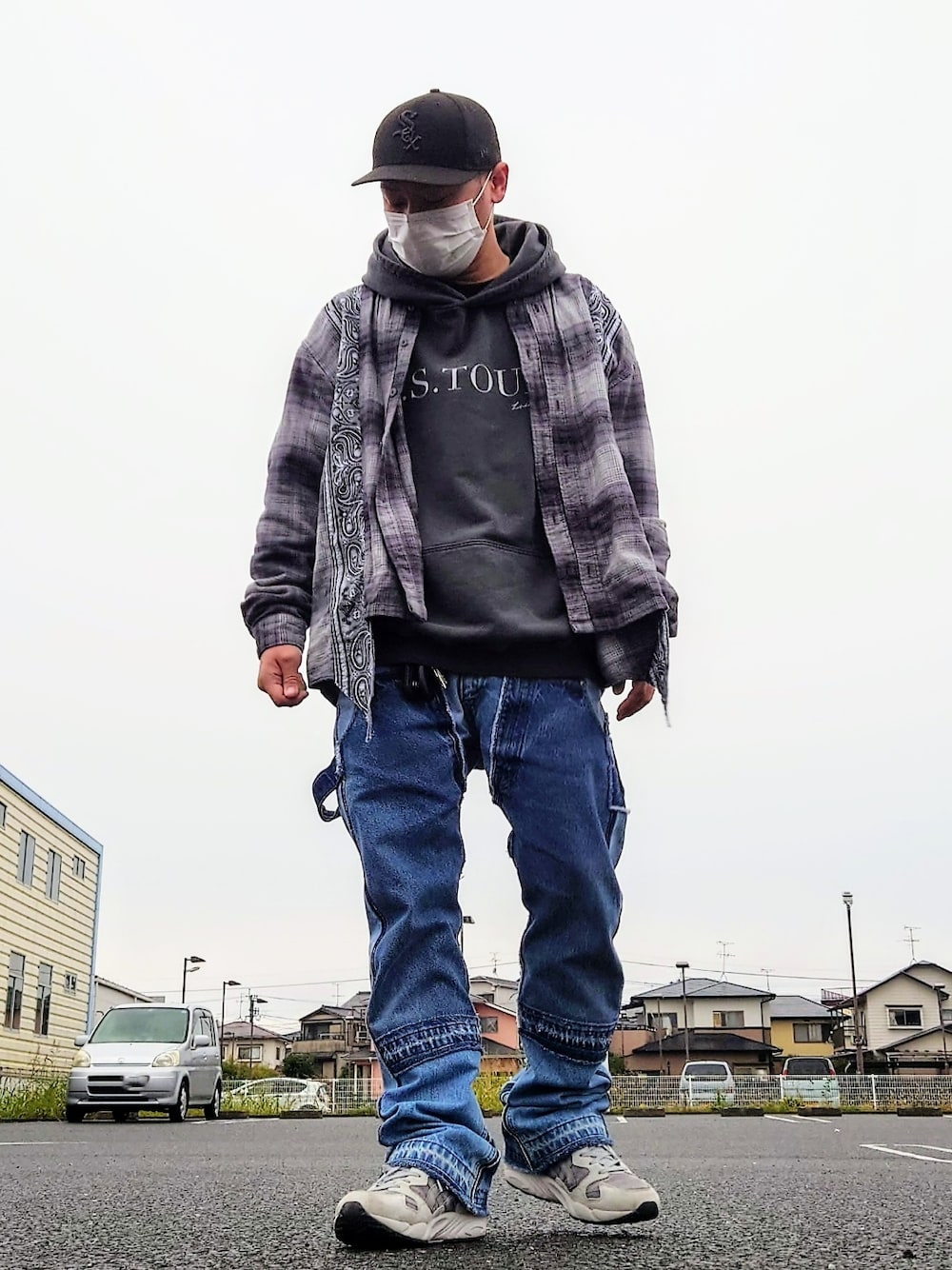 キャップは白刺繍の部分を 油性ペンで塗ってオールブラックに仕上げました。 シャツは2枚のシャツを合体。 アクセントとして、つなぎ目にバンダナをライン状に縫い付けてます。 パーカーの生地感、加工具合、フードのでかさ、どれも理想です。