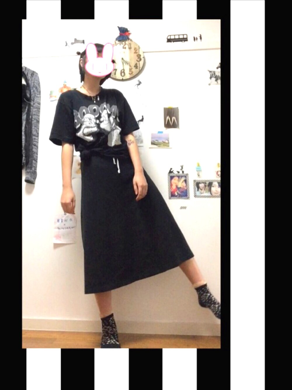 今日はぴっちりしたくない!ってことで、 XLのTシャツにロングスカート🎀 Tシャツはそのまま着るとだぼだぼなので、下を結んで短くしてます🕵