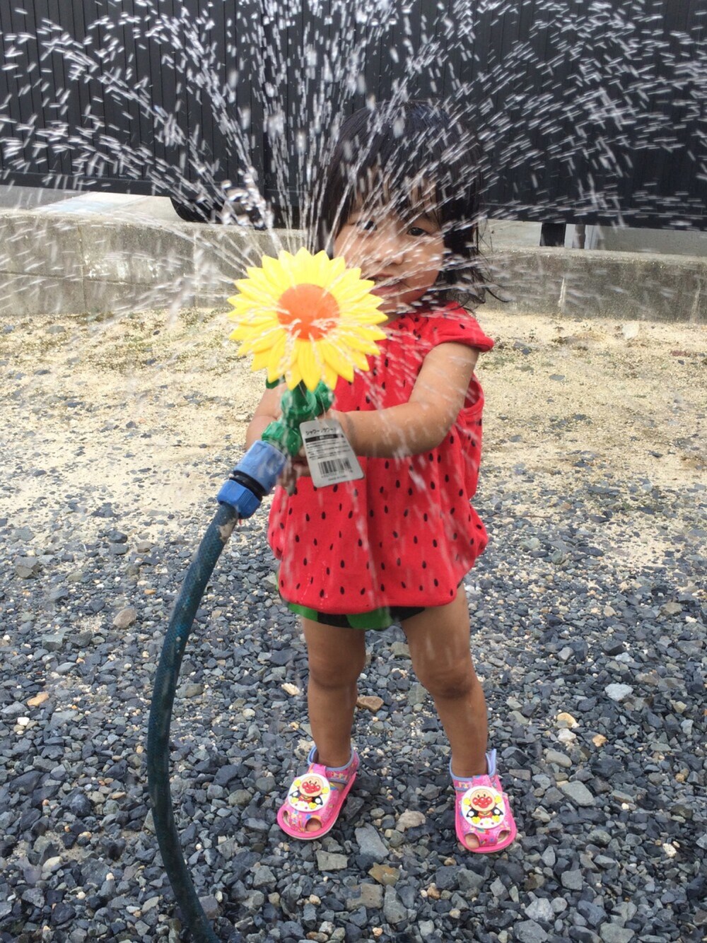 暑かったのでプールの前に水浴び🌱 おばあちゃんが買ってくれたひまわり🌻 ホースに繋ぐとシャワーになって出てくるのが楽しいみたいです💫💫 西松屋のスイカ🍉 可愛くて買ってしまった🌞 今まではパジャマとして着てたのに😅 これをタンスから出してきて着たいとごねました😳😳笑 おばあちゃん家にて