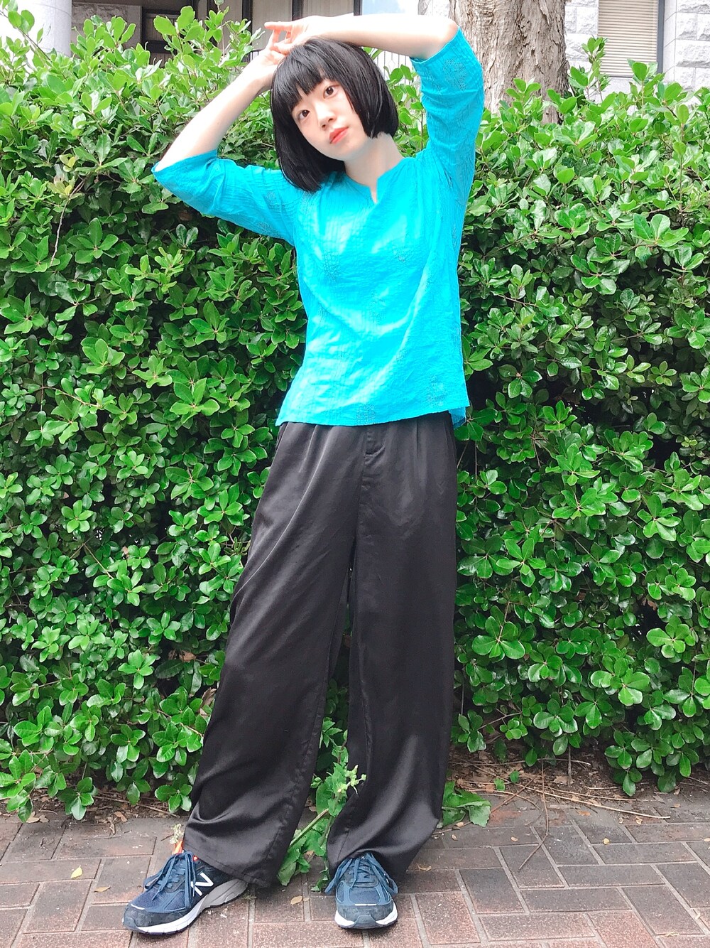 水色インド綿ブラウスに光沢感のあるストレートパンツ、NB990で抜け感