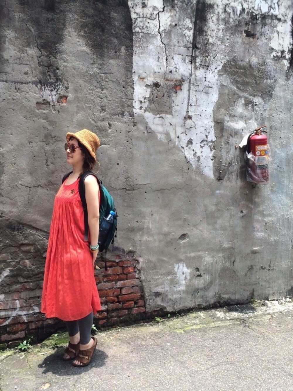 海外旅行では うっかり肩を出してしまいがち。 ぼーし…BEAMS BOY ワンピース…マライカ さんだる…ビルケン リュック…OUTDOOR サングラス…??