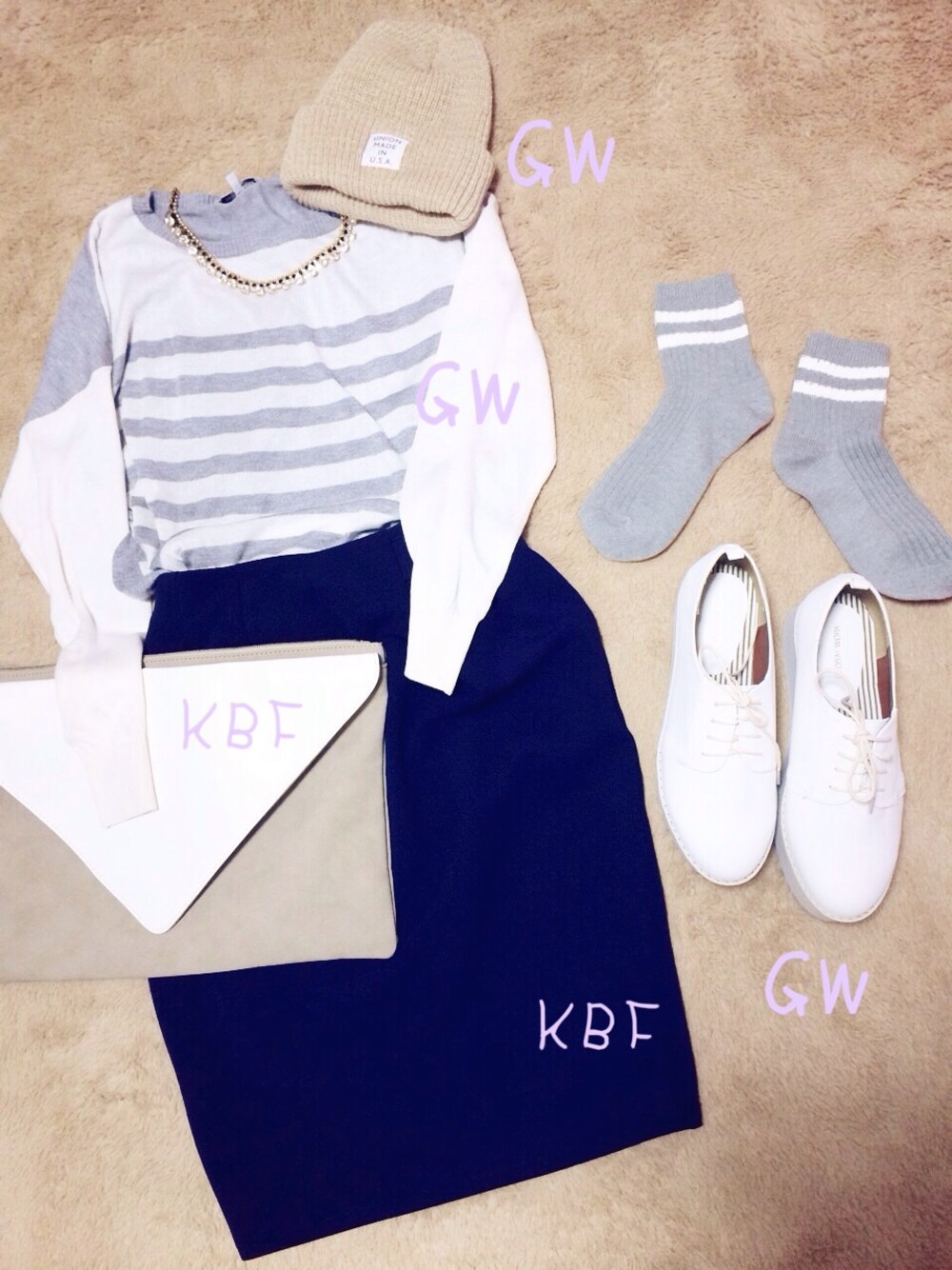 春先まで使える 爽やかネイビー×グレーコーデ♡ 差し色にベージュで抜け感プラス!