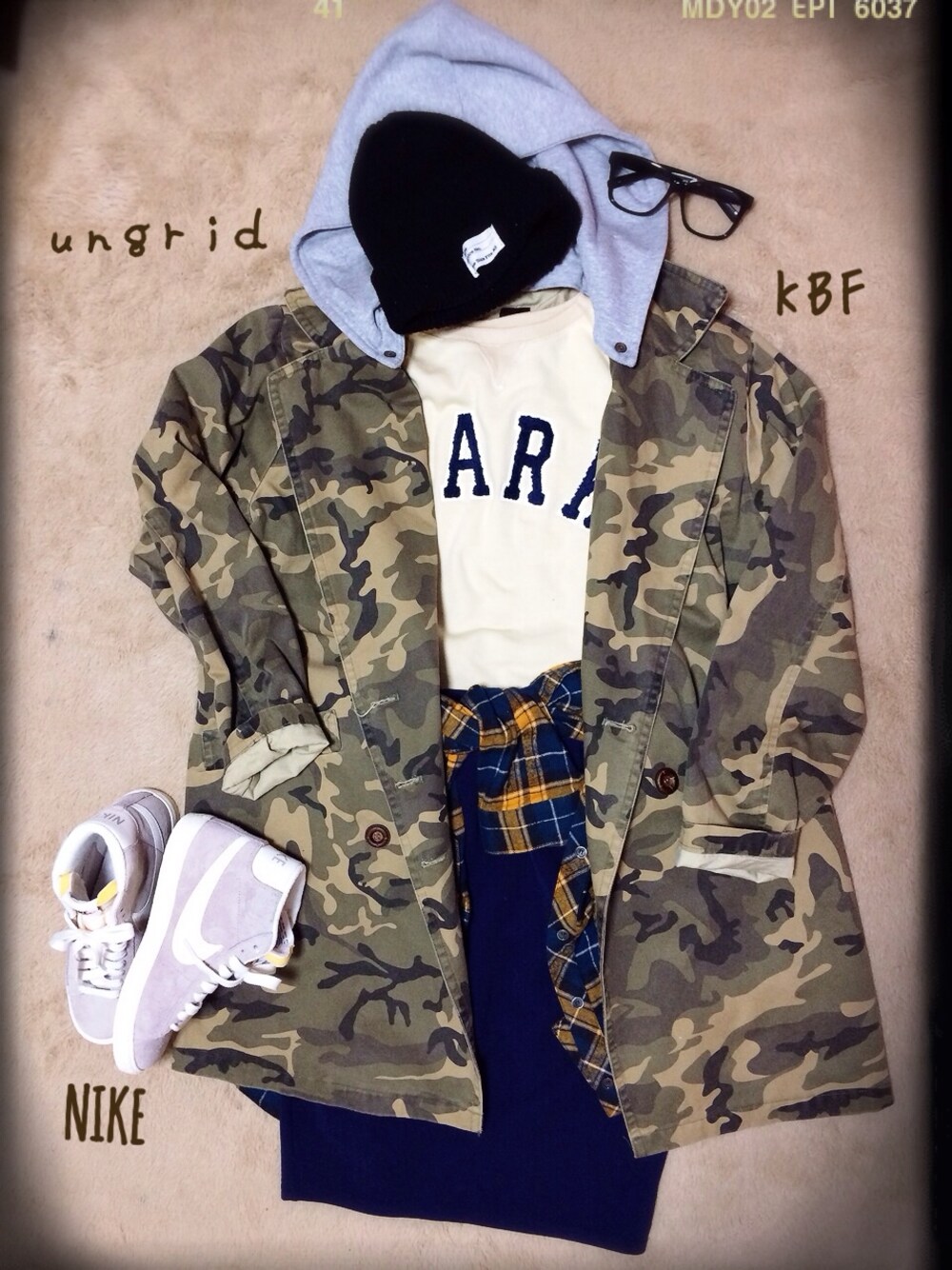 ひとつまえのコーデにカモフラのルーズコートをさらっと羽織る^ ^