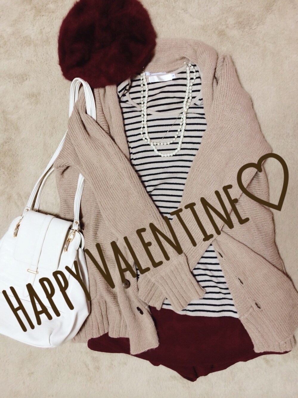 ピンク×ボルドーの女子!なコーデ♡ オーバーサイズのニットカーデで モコモコスタイル^ ^ ※ニットカーデはタグ付けしたのと同型の2012年に出たカラーです。