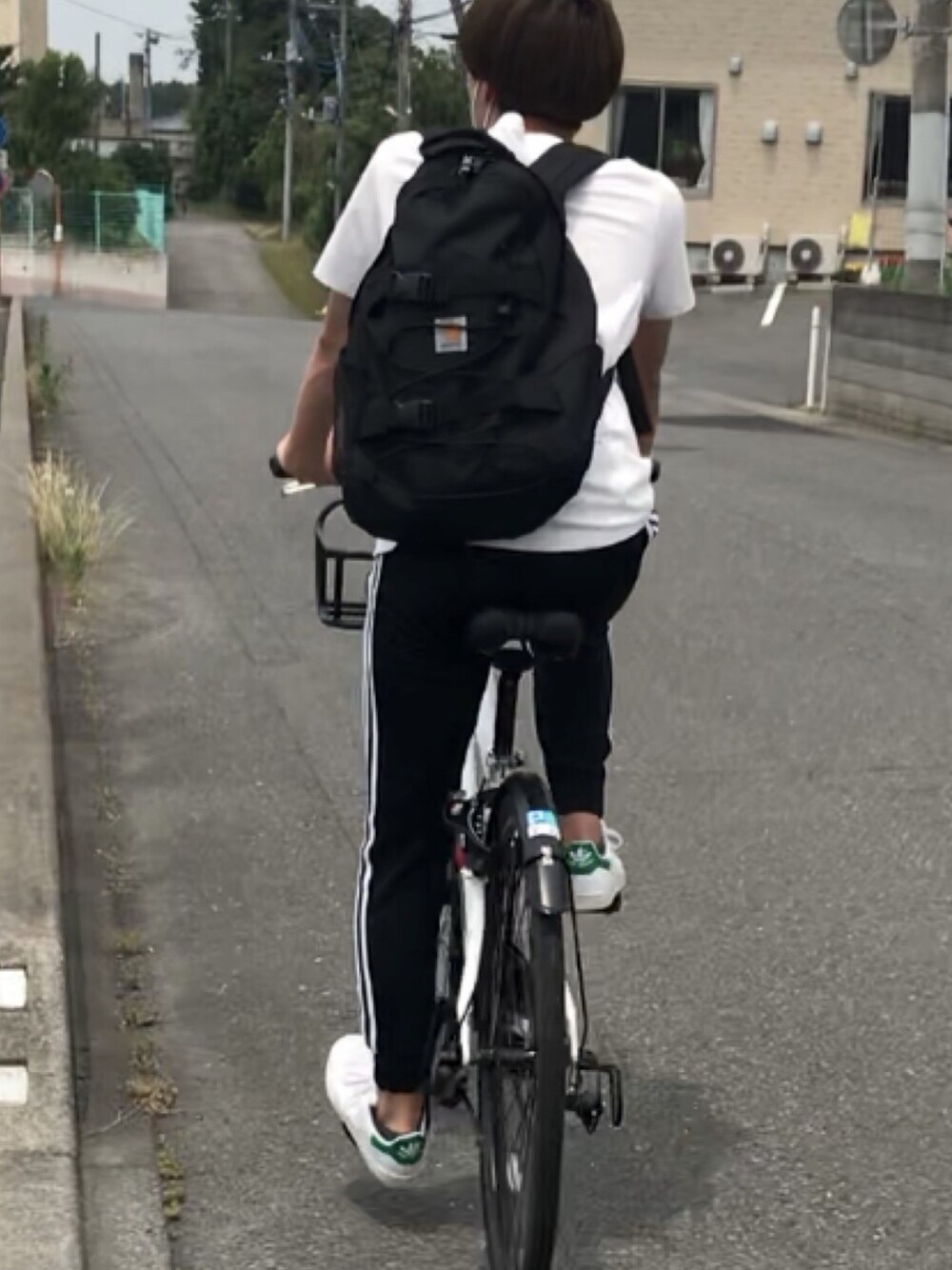 自転車乗ってるところを撮ってもらいました。アディダスの組み合わせ好きです。