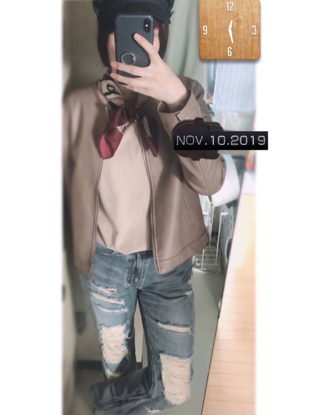 めっきり冬☃️ 今日は日差しあたたかな1日でした🌟 ------------------------- hat ▷ Honeys キャスケット outer ▷Daisy merry ライダースジャケット tops ▷Daisy merry カットソー scarf ▷GU ヴィンテージプリントスカーフ RED bottoms ▷bit blue チェックバッククラッシュデニム pumps ▷BENEBIS スクエアトゥパンプス キャメル 2019.11.10