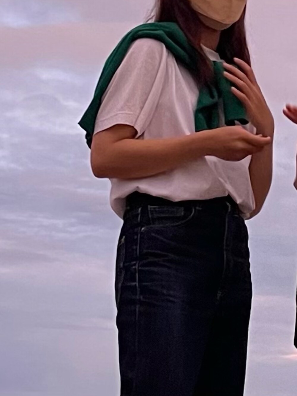 グリーン系のカーディガン/ボレロ、ブラック系のデニムパンツを着用したレディースの秋コーディネートの1枚目の写真