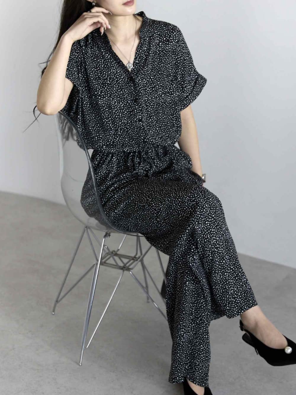 PREFERIR_web(PREFERIR OFFICIAL)のつなぎ/オールインワン「【細見え×抜け感】ランダムドット キーネックオールインワン」を使ったコーディネート