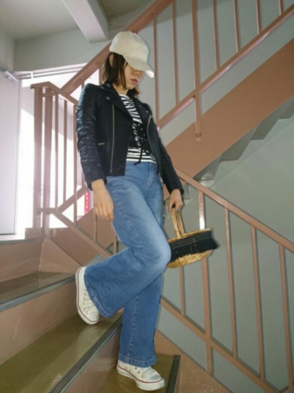 ライダースのカジュアルダウン。リメイクしたかごバッグを使いたくて。 今年はキャップが気分です。